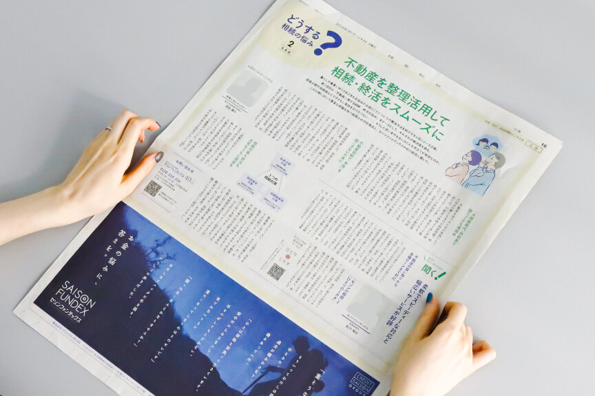 テキストは主に有識者へのインタビューをもとに、「新聞」という掲載媒体と親和性がある、社会状況を織り込んだ文章で作成しました。例えば「相続・終活対策」がテーマの第2回では、高齢者人口の増加に伴う「大相続時代」の到来という世相に触れたうえで、不動産を活用した対策のメリットや注意点のほか、地価高騰の影響といった近年の動向も踏まえながら、注目されている対策例として「リースバック」「不動産担保融資」といった同社の事業を紹介しています。広告色を抑えた客観的な記述で、情報価値の高い「ニュース」として伝えることで、読者に読まれる「届く」プロモーションになることを目指しました。