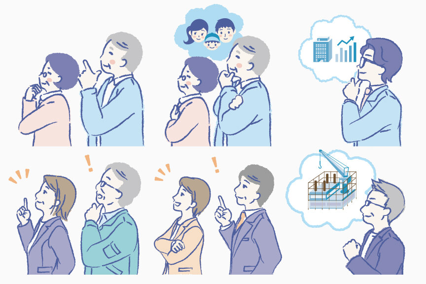 また、月に1、2回と掲載間隔が空くことから、各回フォーマット性の強い紙面体裁に統一することで、シリーズ企画であることを読者が認知しやすいようにしました。左上に「どうする、〇〇の悩み?」というキャッチコピー、右上にイラストを配置。「〇〇」は回ごとに「老後」「相続」「投資」「事業」「融資」「資金」と、内容に合わせた言葉に置き換え、イラストでも端的に内容を表現して、各回のテーマが速やかに伝わるようにしています。